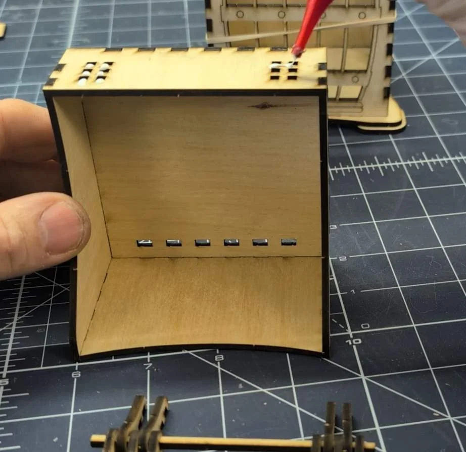 Passons à l’étape suivante avec assurance ! Répétez le processus d’encollage sur la deuxième pièce en appliquant méticuleusement la colle dans chaque encoche. Positionnez-la avec précision à côté de la première pièce, en l’ancrant fermement dans la base. Vous constaterez immédiatement une différence notable : la structure gagne considérablement en stabilité grâce à cet effet de contrefort.